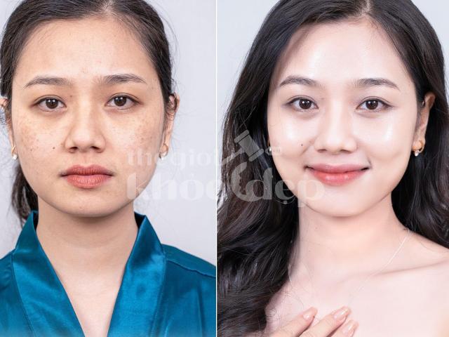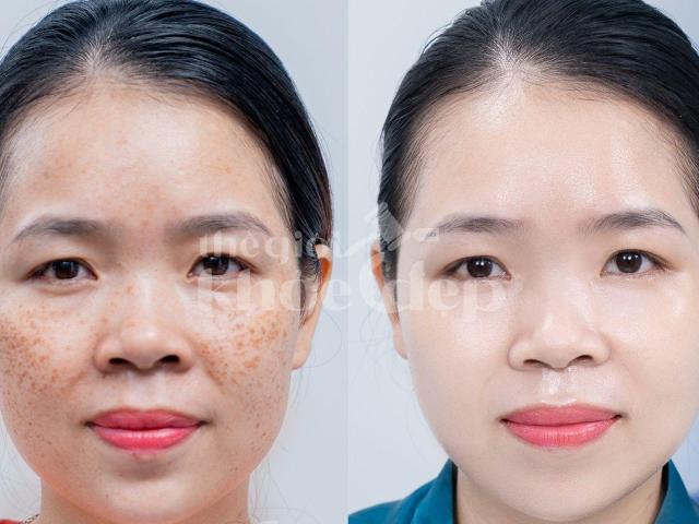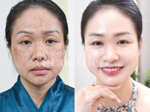 • Trường hợp chị Mai (42 tuổi, TP.HCM): nám hỗn hợp, điều trị 6 buổi, kết quả giảm 90%, da đều màu, căng bóng.